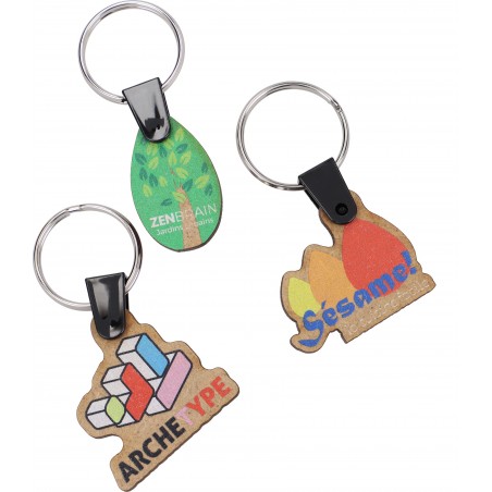 Llavero de MDF (tablero de fibra de densidad media) Forma especialmente cortada con una plantilla de 35 x 35 mm o 45 x 45 mm. Grosor: 3 mm Impresión digital a todo color por una cara Fijación de plástico con anilla metálica de 25 mm.