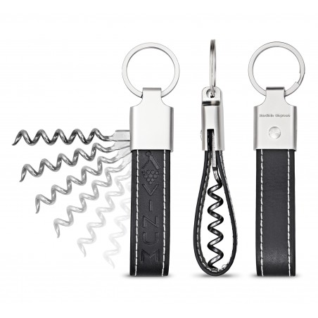 Llavero de piel sintética + zamac Dimensiones: 96x20mm Acabado níquel brillante Sin marcas Sacacorchos de 5,5cm incluido Correa de PU (piel opcional) Color de la correa: negro Otros colores disponibles como opción